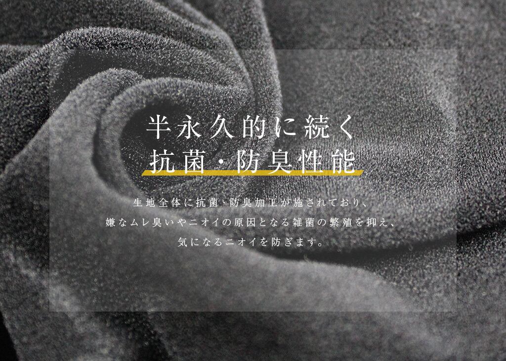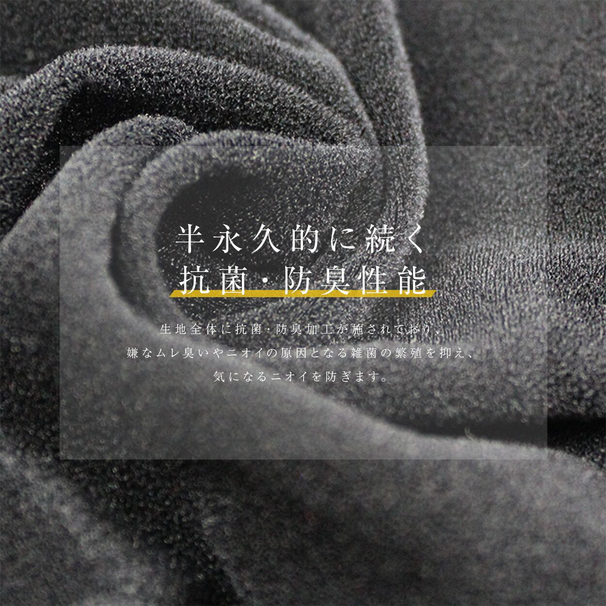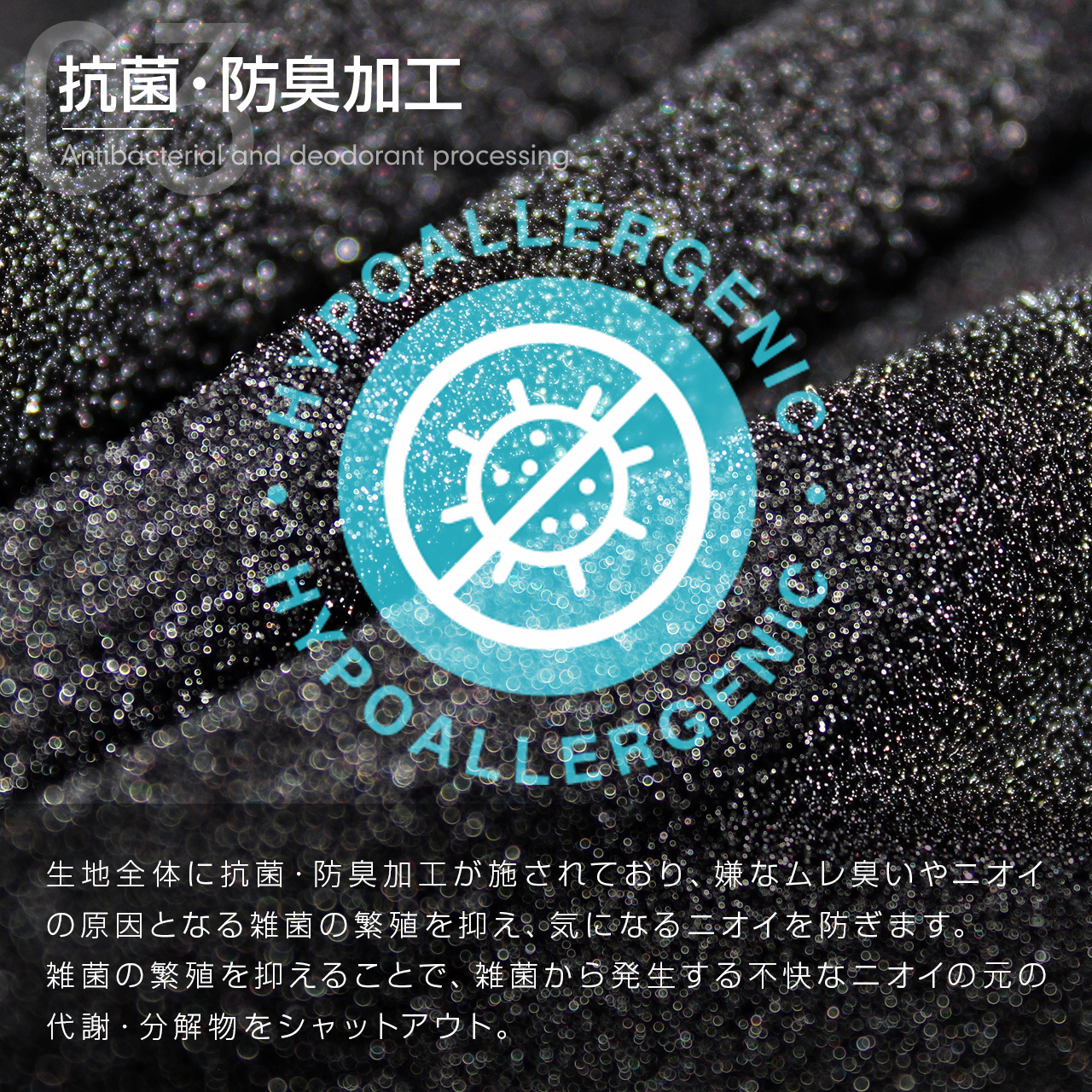 また、生地全体に抗菌・防臭加工が施されており、嫌なムレ臭いやニオイの原因となる雑菌の繁殖を抑え、気になるニオイを防ぎます。