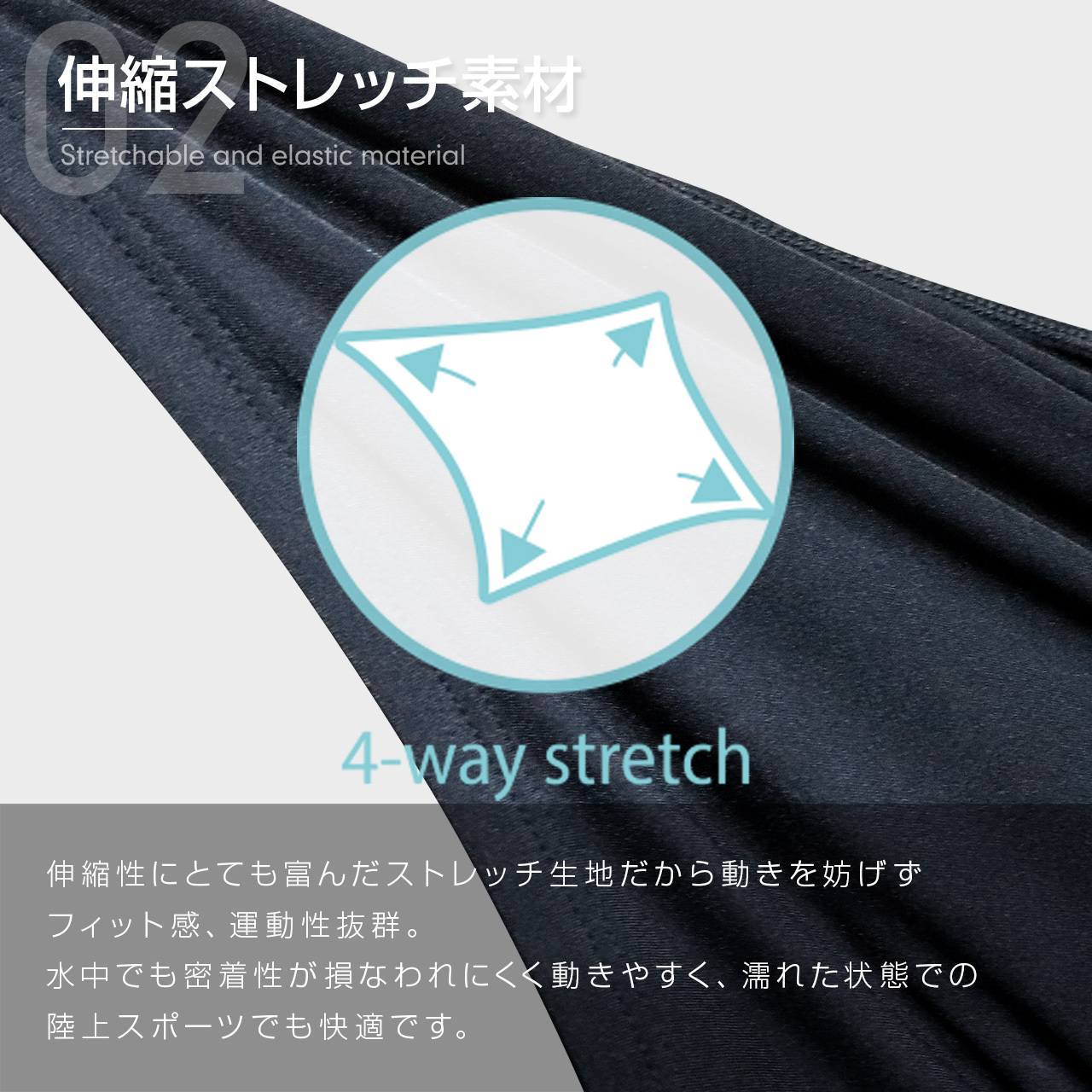伸縮性にとても富んだストレッチ生地で動きを妨げずフィット感、運動性抜群。水中でも密着性が損なわれにくく動きやすく、濡れた状態での陸上スポーツでも快適です。