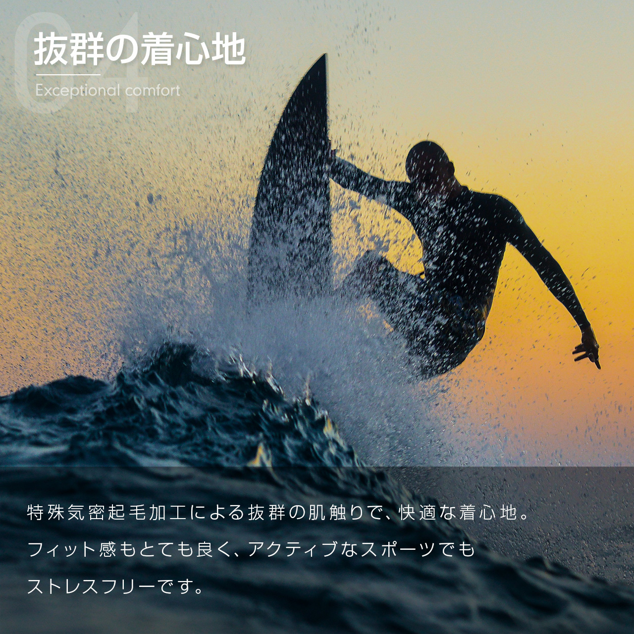 起毛素材は暖かい・・・それは、体と生地との間の‘空気層'が温められる事による温熱効果です。通常の起毛は、水中では空気層がつぶれてしまい、しっかりと空気の層を作ることができません。