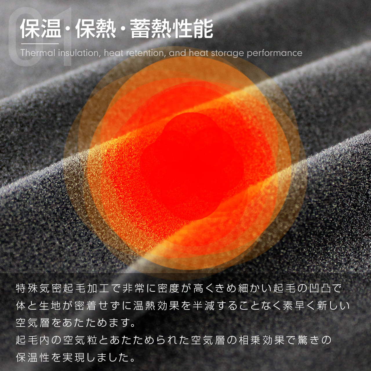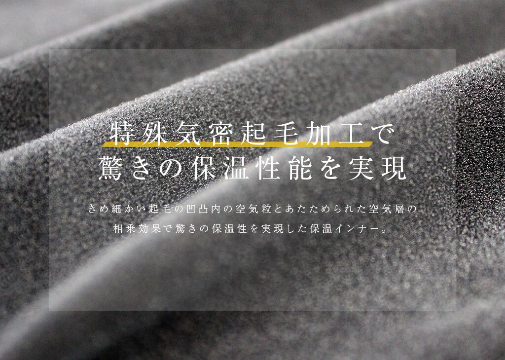 特殊機密起毛加工により、きめ細かい起毛の凹凸内の空気粒とあたためられた空気層の相乗効果で驚きの保温性を実現した保温インナー。