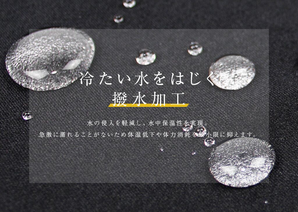 撥水加工により水の侵入を軽減し、水中保温性を実現。急激に濡れることがないため体温低下や体力消耗を最小限に抑えます。