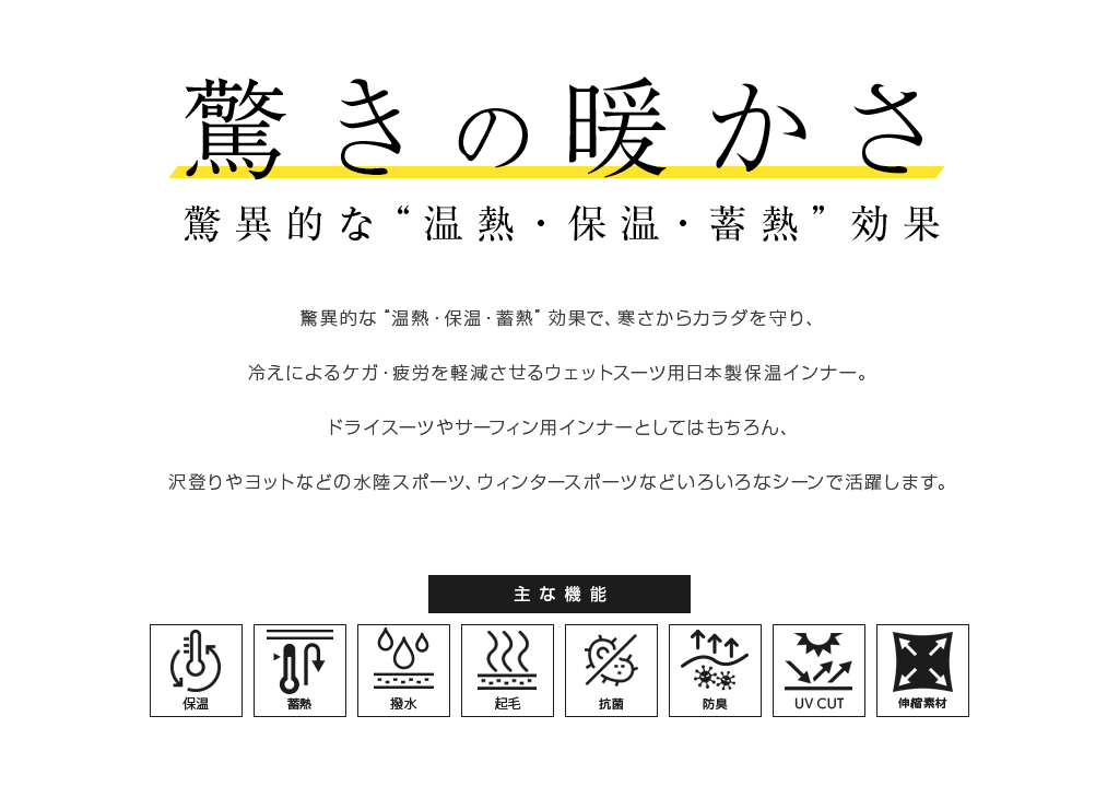 驚異的な“温熱・保温・蓄熱”効果で、寒さからカラダを守り、冷えによるケガ・疲労を軽減させるウェットスーツ用保温インナー。