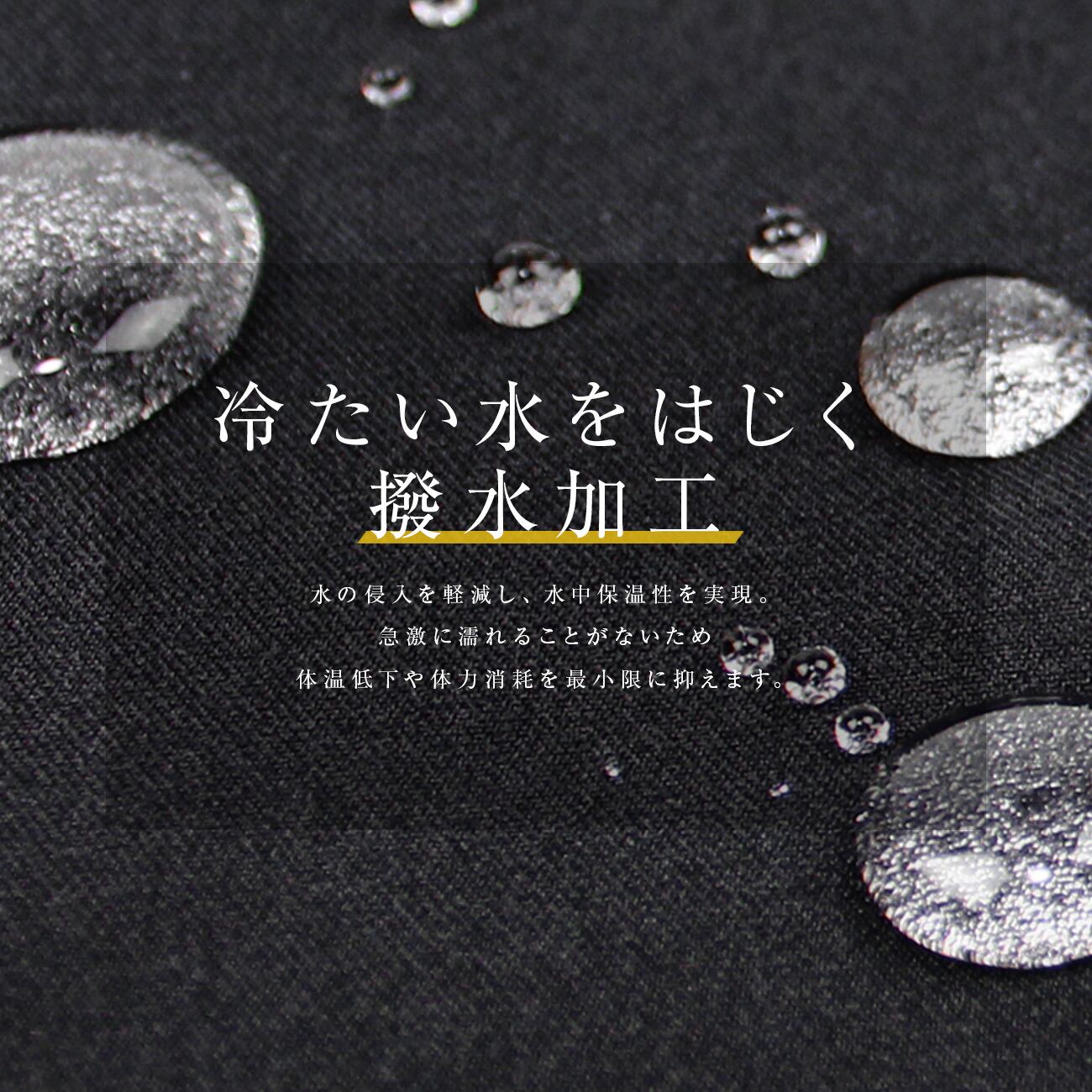 撥水加工により水の侵入を軽減し、水中保温性を実現。急激に濡れることがないため体温低下や体力消耗を最小限に抑えます。