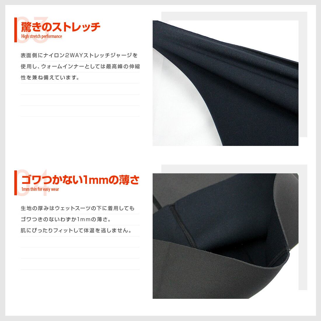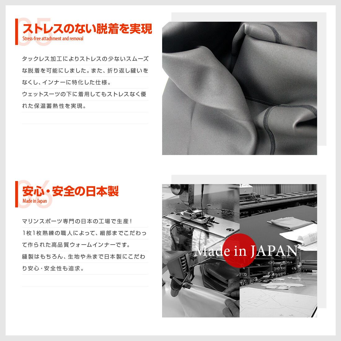 タックレス加工によりストレスの少ないスムーズな脱着を可能にして、折り返し縫いなどを無くしたインナーに特化した仕様で仕上げ、ウエットスーツの下に着用してもストレス無く優れた保温蓄熱性を実現しました。
