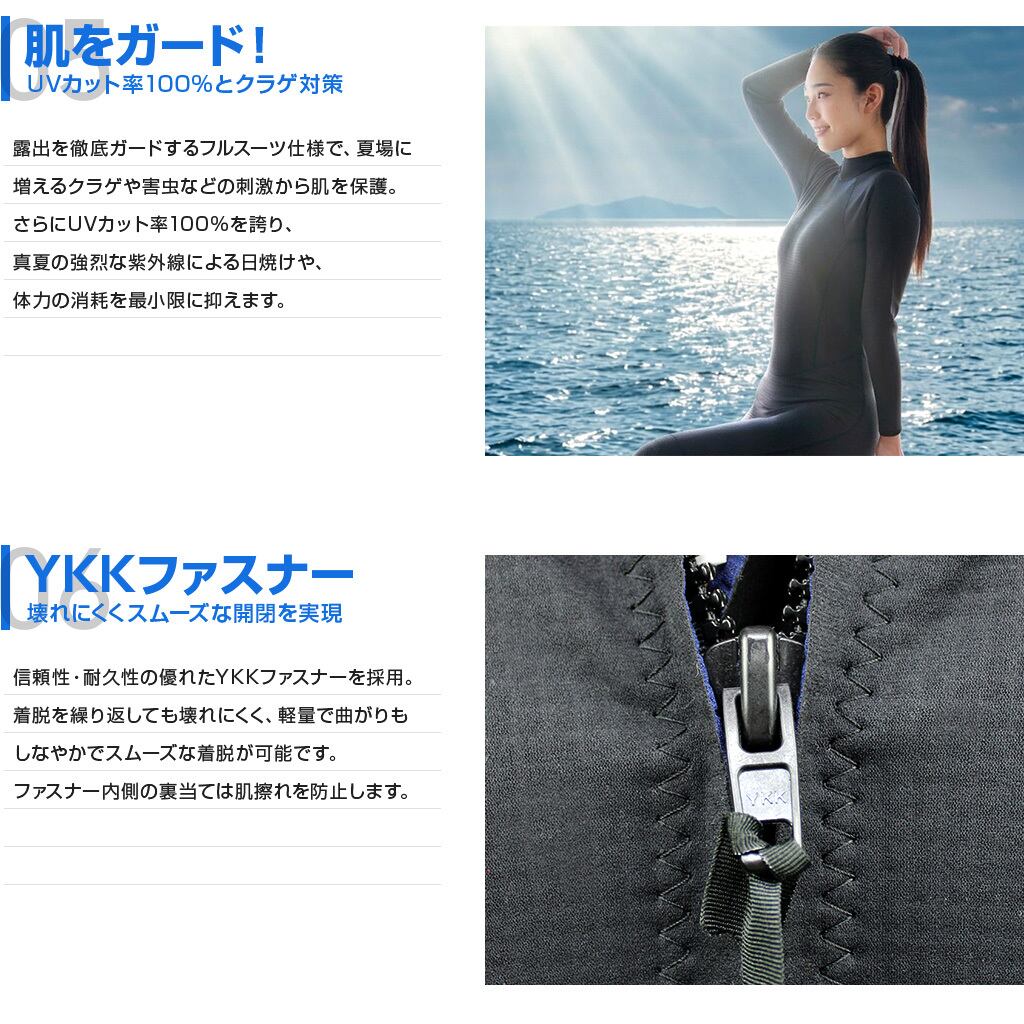 露出を徹底ガードするフルスーツ仕様で、夏場に増えるクラゲや害虫などの刺激から肌を保護。
