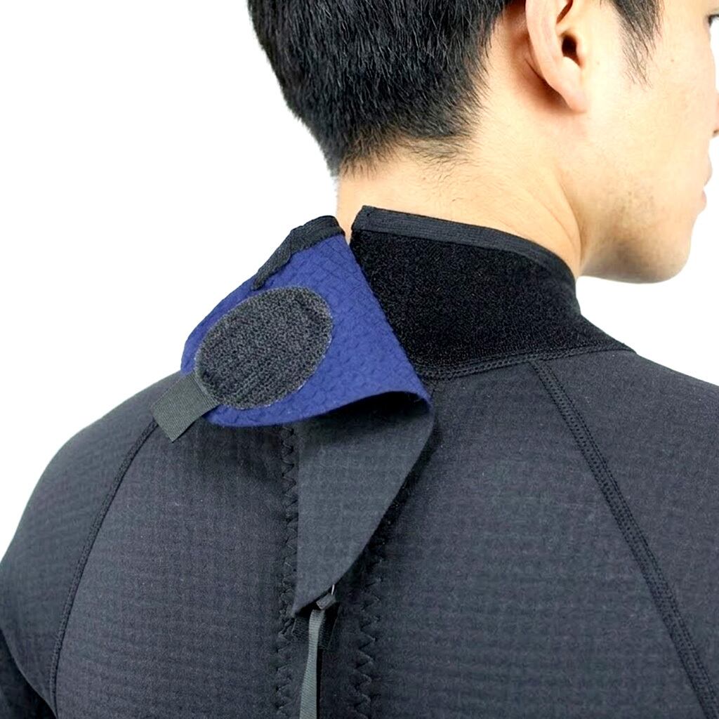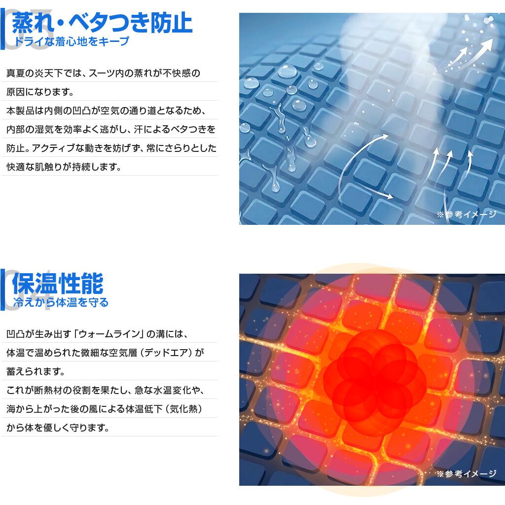 これが断熱材の役割を果たし、7~9月の急な水温変化や、海から上がった後の風による体温低下(気化熱)から体を優しく守ります。