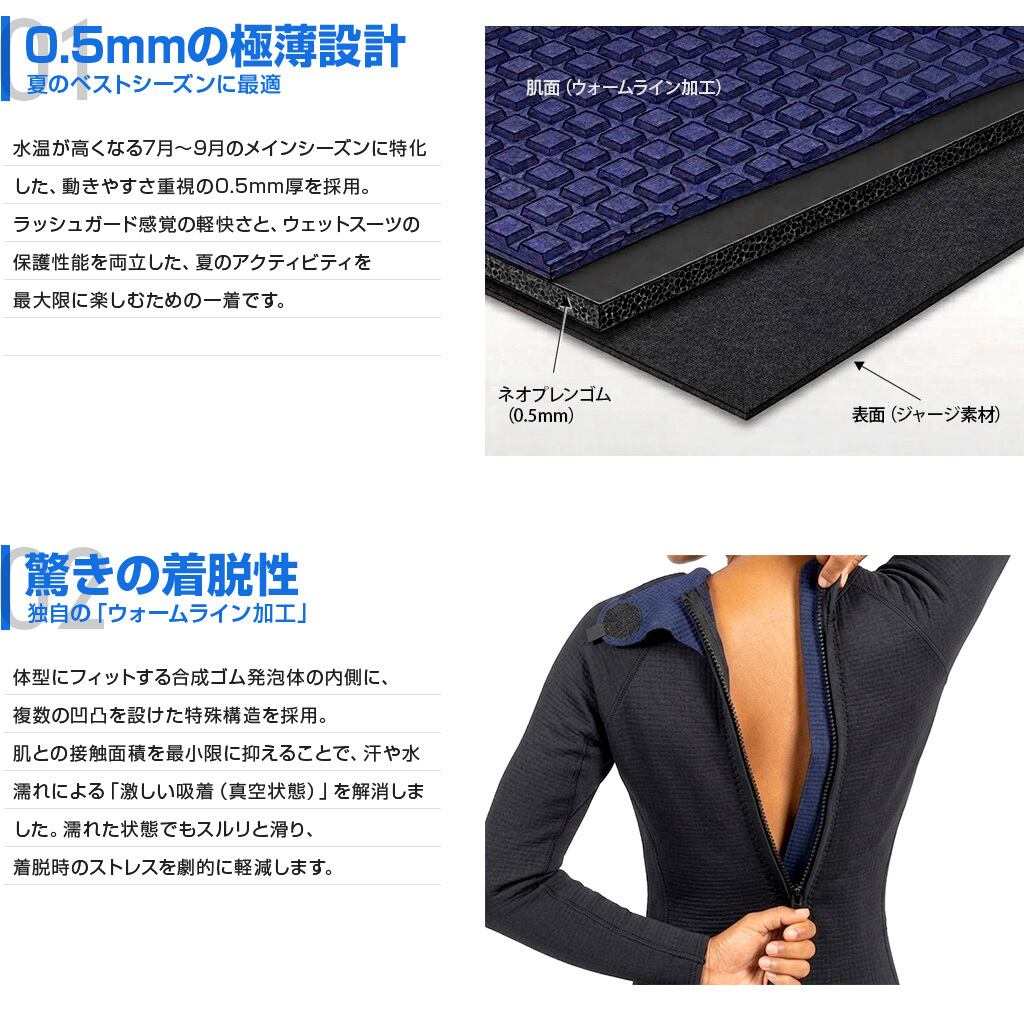 体型に吸い付くようなフィット感と、夏場に最適な0.5mmという極薄設計を両立した、次世代のハイパフォーマンス・スーツです。
