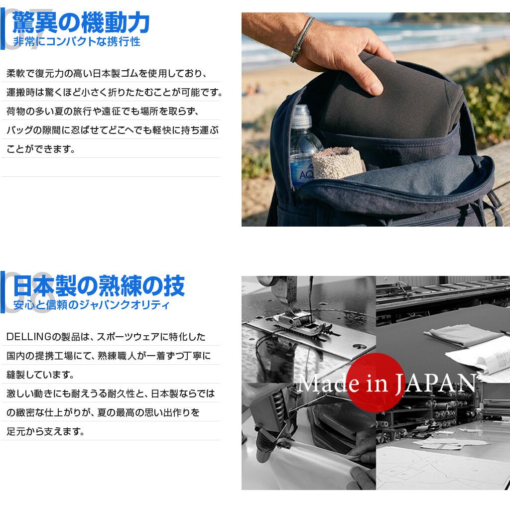 荷物の多い夏の旅行や遠征でも場所を取らず、バッグの隙間に忍ばせてどこへでも軽快に持ち運べます。