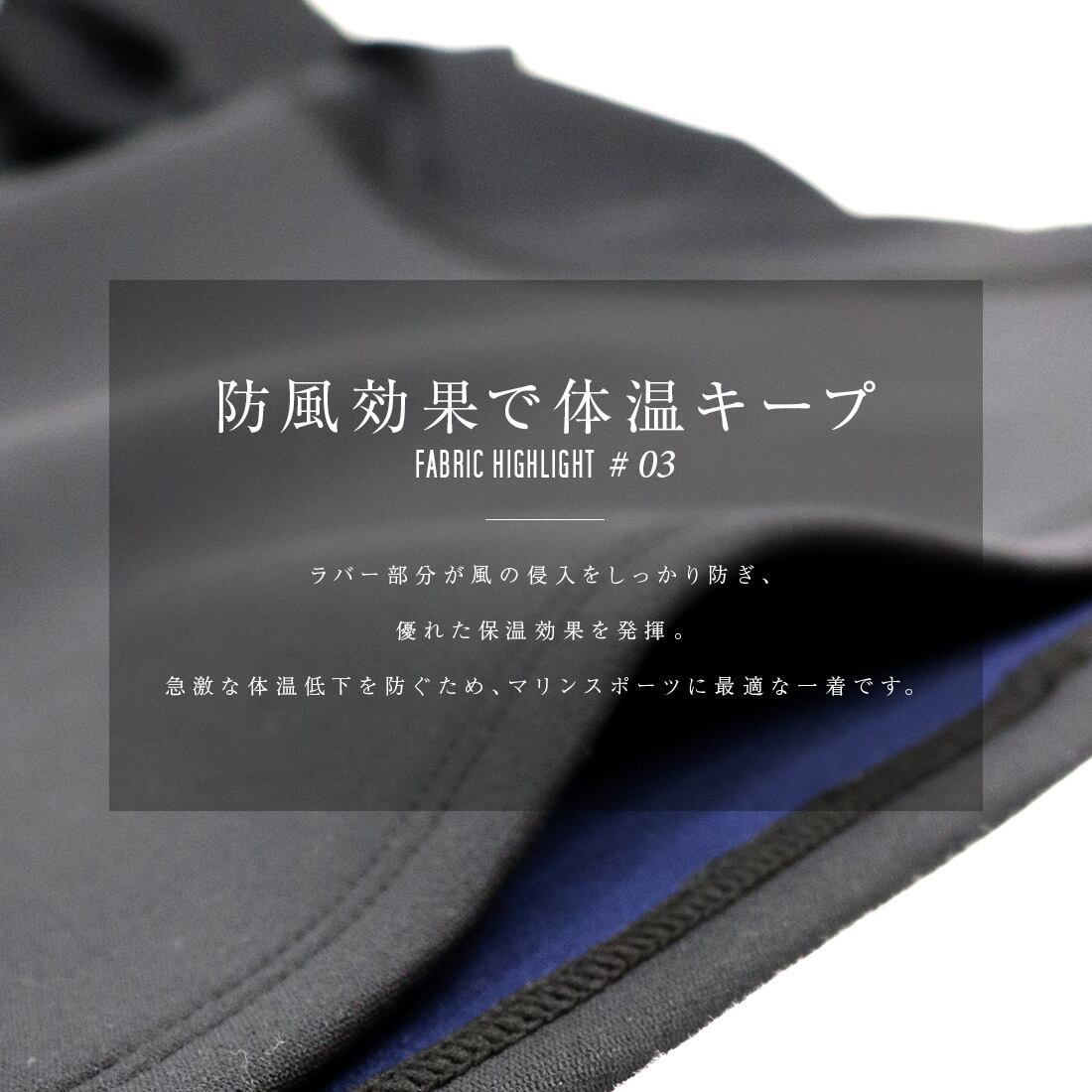 1.5mmの日本製クロロプレーンラバーを採用し、水温の低さや風による体温低下を劇的に軽減します。