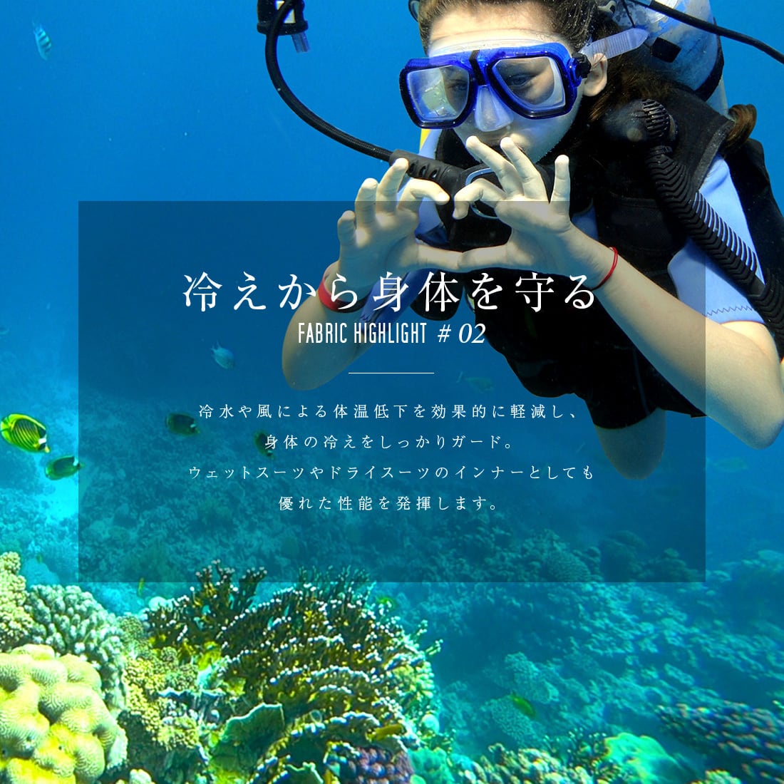 2mm厚のタッパーと比べ圧迫感が少なく、ウエットスーツやドライスーツのインナーとしても軽快な着心地です。
